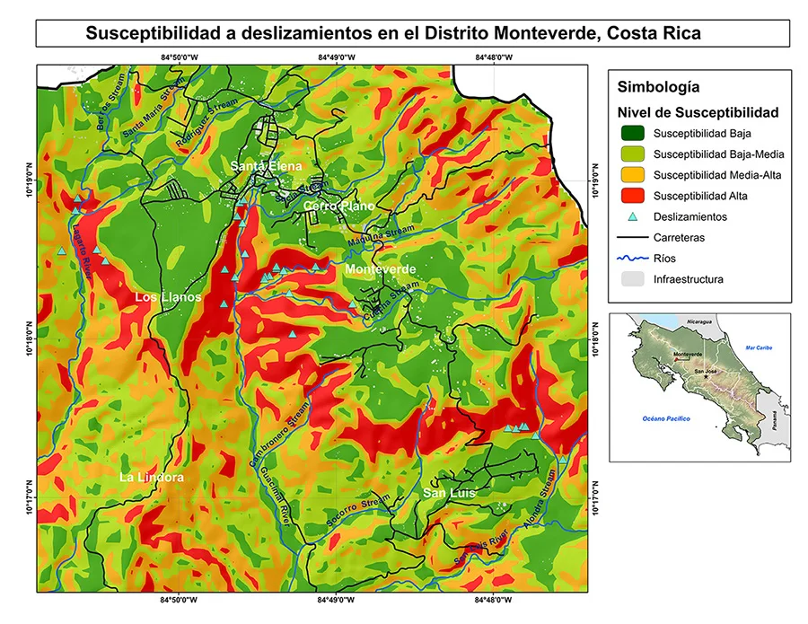 El experto en SIG del Instituto, Randy Chinchilla, ha estudiado 29 de los deslizamientos utilizando fotos aéreas y aviones no tripulados, creando un mapa para mostrar dónde se encuentran las áreas de mayor peligro, buena información para los desarrolladores que consideran la construcción en el futuro. En el área de estudio de 8558 hectáreas, todos los 29 de los deslizamientos de tierras fueron en áreas boscosas. Los deslizamientos fueron distintos según el tipo de suelo, la pendiente y el tipo de deslizamiento. Lo que quedó claro es que las pendientes de 15% de inclinación o más fueron las más peligrosas. No solo fue el peligro inmediato de cuando una mezcla de árboles y escombros se derrumba cuesta abajo, sino que más tarde, cuando los escombros formaron represas que luego rompían y tiraban todo hacia abajo con una fuerza destructiva que inundaba enterrando caminos, pastizales, partes de bosques y arroyos.