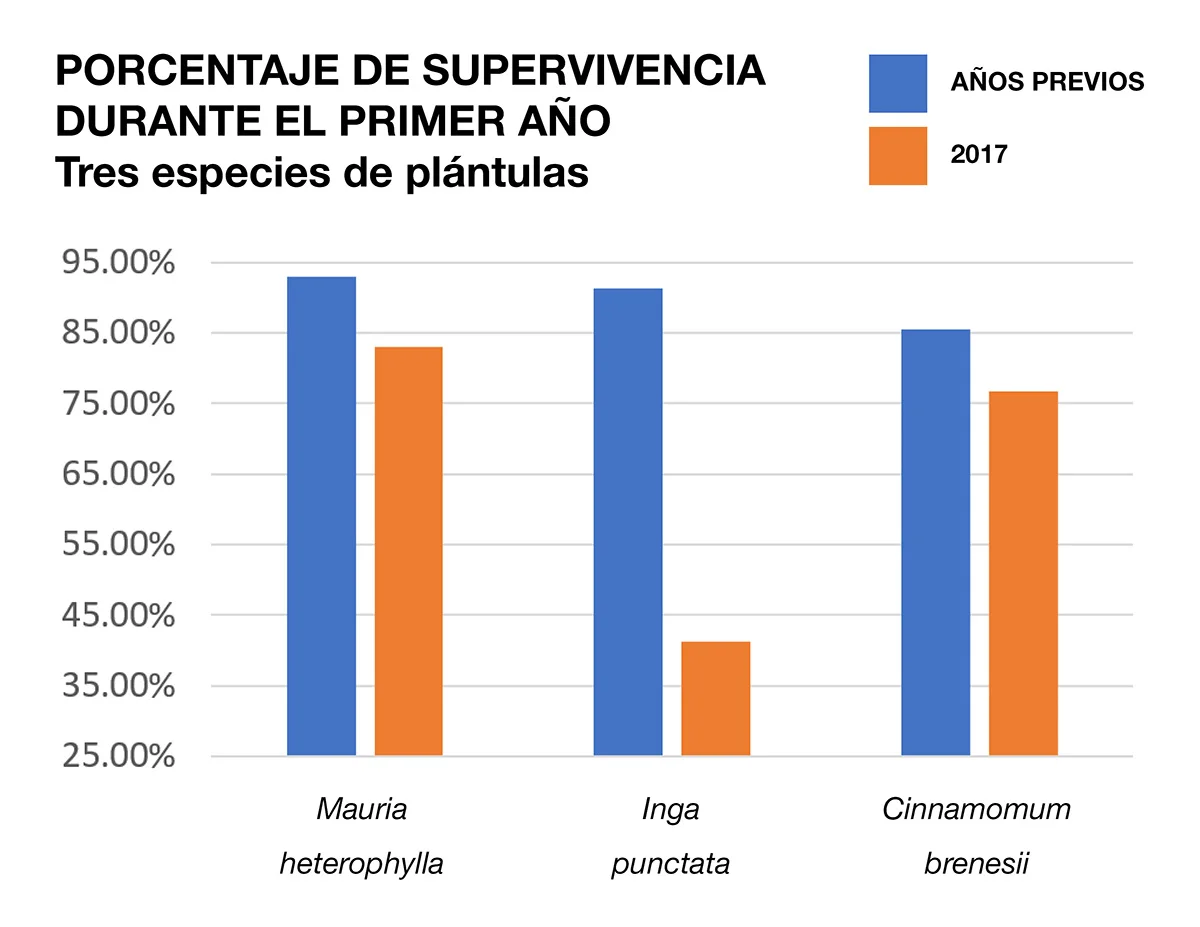 El Instituto Monteverde y la Fundación de Conservación de Costa Rica han estado trabajando en la reforestación del área por más de 20 años. Cada año, proporcionan a las familias y agricultores al menos 10,000 árboles de plántulas de variedades críticas. En estos años, han proporcionado 250,000 árboles de 140 especies a 43 familias, así como a varias reservas naturales. Naturalmente, les preocupaba la tasa de supervivencia de los árboles jóvenes plantados en junio de 2017 y se apresuraron a evaluar la situación. Debra Hamilton dirigió la investigación de 3 especies de diferentes familias (Fabaceae, Lauracacae y Anacardiaceae). Las fuertes lluvias de la Tormenta Tropical Nate afectaron negativamente la supervivencia de las plántulas plantadas ese año. Se alegraron al descubrir que, aunque el Inga no sobrevivió bien las demás tuvieron tasas de supervivencia superiores al 70%.